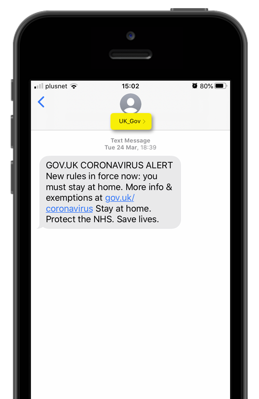To help tackle the growing issue, the UK government has added both UK_GOV and UKGOV to the list of restricted SMS Sender ID. Ensuring all text messages sent using these sender IDs are automatically stopped by mobile networks, and therefore are not delivered to recipients unless coming from an official channel – please see example message to right-hand side, with sender ID highlighted for reference.