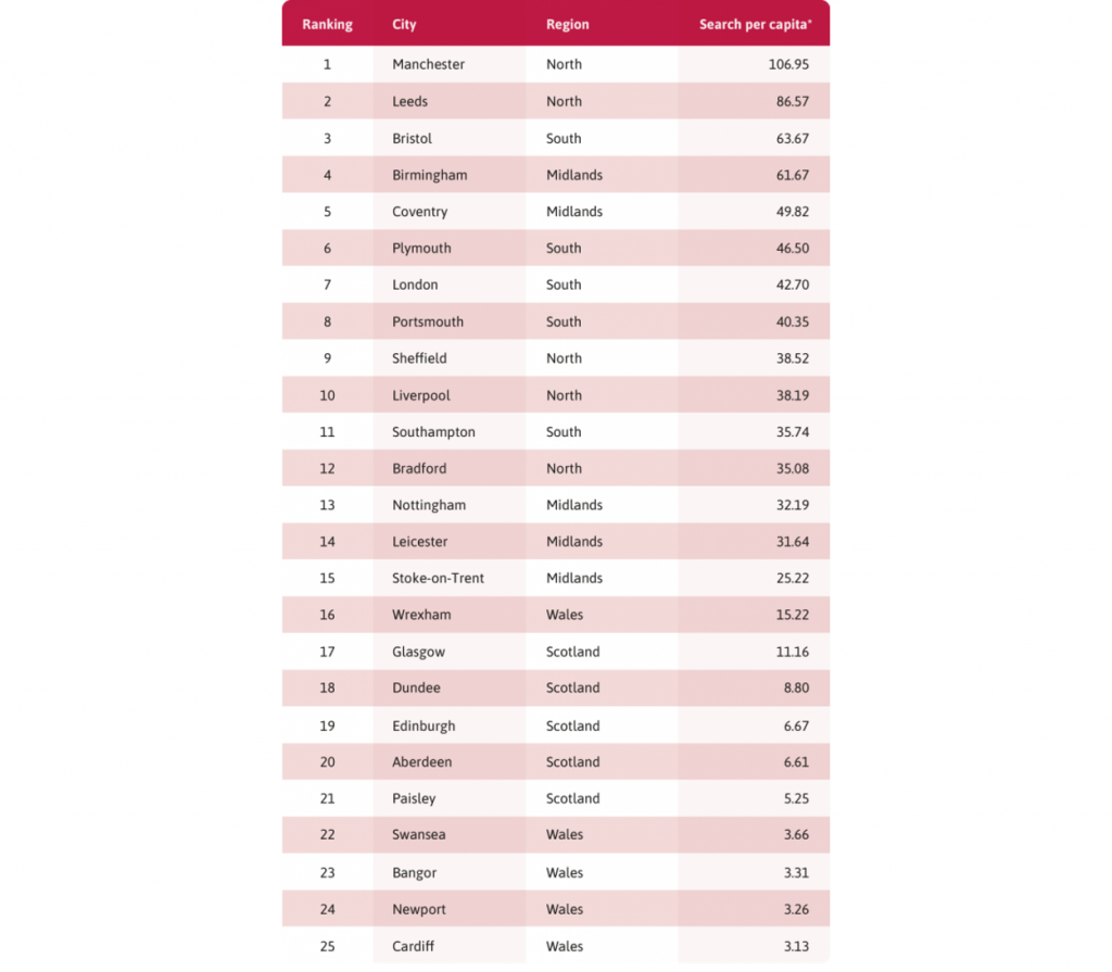 To gather the data, we used Google’s Keyword Planner tool to break down the search volume for the five largest cities in each region of the UK from March 2021. We gathered data on search terms related to gyms and leisure centres reopening including ‘when do gyms open’, ‘when do gyms reopen’ and ‘when do leisure centres reopen’ and compared this against population data to work out the searches per capita for each city and region.